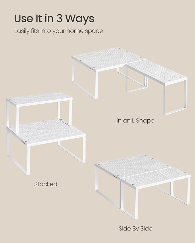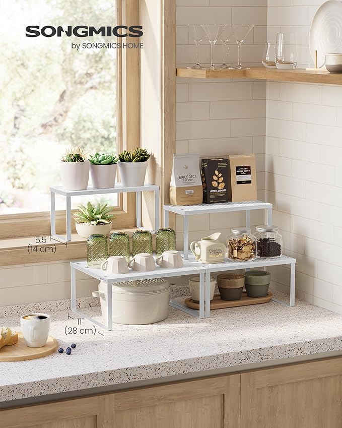 SONGMICS Spice Racks, Set of 2 Metal Cabinet Shelf Organizers, Countertop Organizers, Shelf Risers, Stackable, Expandable, White UKCS005W01
