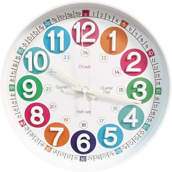 - Colorful Clock Face And 3D Numbers:The rainbow color numbers clearly marked inside,a learning clock that teaches through a 1-60 numerical scale and readable wall clock moments. Perfectly combines 12/24 hour format for effortless mastery.3D digital clock face, more suitable for hanging on the wall, see more clearly.Different from other clock faces.