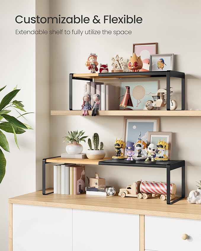 SONGMICS HOME Spice Racks, Expandable Cupboard Shelf Orgnizers, Kitchen Counter Shelves, Bamboo and Metal, Space-Saving Shelving, Stackable, Light Bamboo and Ink Black UKCS051B01