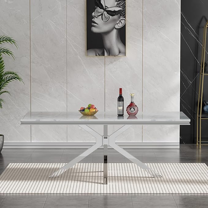 - Elegant Faux Marble Table Set for 6 People : The rectangular dining table boasts a sleek 70-inch faux marble MDF tabletop, ensuring durability and easy maintenance. Paired with sturdy and stable X-shape Mirrored Stainless Steel Base, this dining table set offers both style and reliability for everyday use.