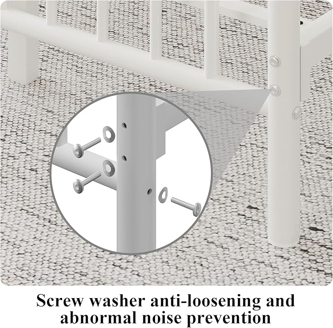 - Noise-free design: Our metal bed frame is equipped with EVA silent strips that effectively prevent noise caused by friction between the slats and metal. Additionally, we added screw washers to fix the screws of the bed legs that enhances stability, effectively avoiding issues with loose screws due to prolonged use, ensuring a peaceful sleep experience without creaks