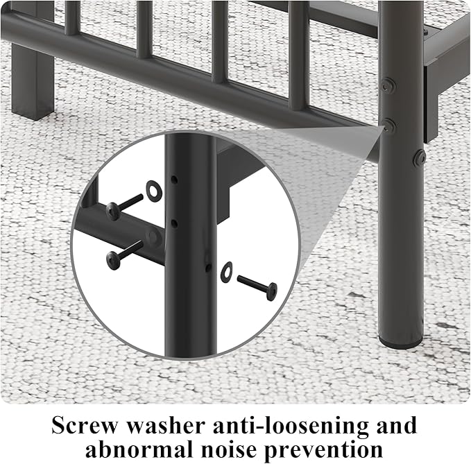 - Noise-free design: Our metal bed frame is equipped with EVA silent strips that effectively prevent noise caused by friction between the slats and metal. Additionally, we added screw washers to fix the screws of the bed legs that enhances stability, effectively avoiding issues with loose screws due to prolonged use, ensuring a peaceful sleep experience without creaks