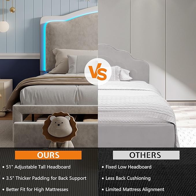 Jocisland Twin Bed Frame with 51" Tall & Thick Adjustable Headboard, Storage Drawer, RGB LED Lights, No Box Spring Needed, Velvet Upholstered, Grey