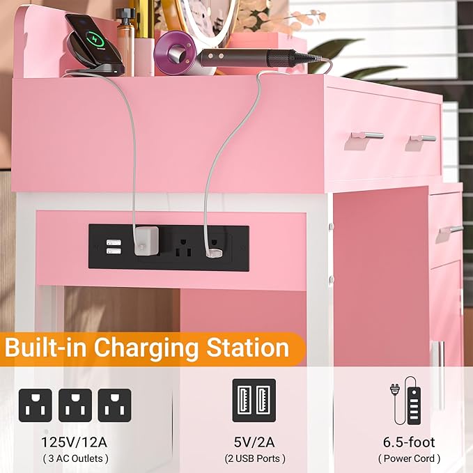 - Vanity Desk with Charging Station: Come with updated design charging station with 3 AC outlets and 2 USB ports, you can easily use curling iron or hair dryer in front of the mirror, and charge your phone or other mobile devices during makeup.