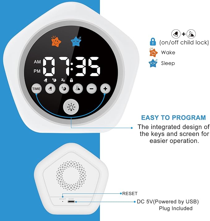 - EASY TO USE: Alarm clock for toddlers can be quickly off with the press of any small button. Just 7 buttons to set bedtime, wake up time, brightness and sound adjustment, snooze, child lock.
