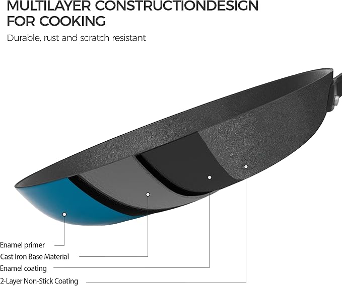 - NON-STICK FRYING PAN FOR EVERYDAY COOKING: The non-stick surface ensures easy cooking and cleaning, while the 8-inch enameled cast iron frying pan is a solid choice for cooking eggs, omelets, grilled cheese, and more with flying colors. Perfect Skillet for Everyday Cooking!