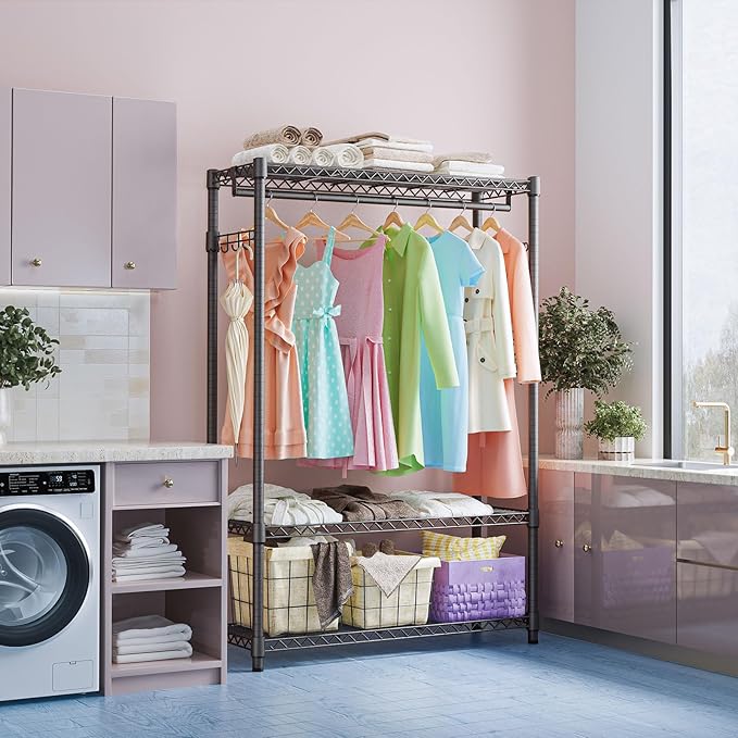 - Height Adjustable: This 3-tier clothing rack features a sturdy hanging rod and two sets of side hooks, offering flexible storage for garments, shoes, and accessories. The adjustable shelves can be repositioned to fit items of varying heights, allowing you to customize your storage layout for hanging clothes, folded garments, or footwear with ease.
