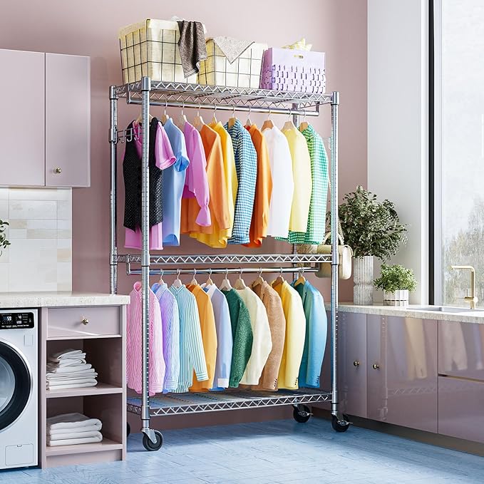 - Rotatable 360° Wheels And Versatile: This rolling clothes rack has 4 heavy-duty rolling wheels, and thus you can easily move anywhere you need, such as the showroom entry closet, bathroom, garage, laundry room, hallway, balcony, bedroom, cloakroom, and more. And 2 of them are lockable, which ensures more security