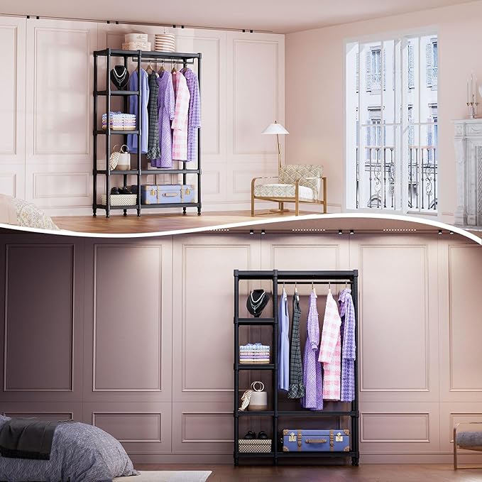 - Height Adjustable: The clothes rack includes a sturdy hanging rod and adjustable shelves, offering versatile storage solutions. Easily modify shelf heights to fit shoes, hanging garments, and folded items, allowing you to tailor the space to your specific needs.
