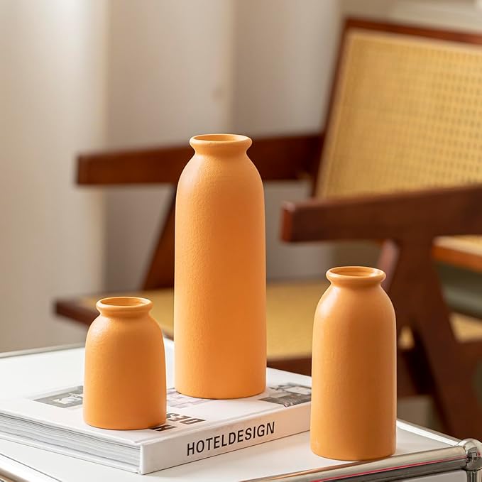 Ceramic Vase Set-3, Small Flower Vases for Decor, Modern Boho Farmhouse Style, Decorative Vases for Pampas Grass & Dried Flowers, Distressed Finish (Orange)