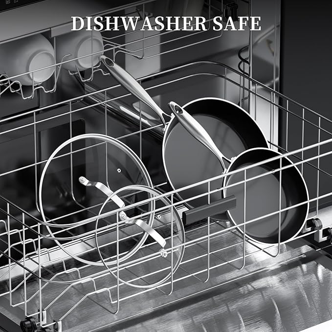 - 【Comfort Design】Titanium ceramic skillets with lid features comfortable ergonomically designed handles; the cast stainless steel handles stay cool to the touch at low temperatures for a more enjoyable cooking experience while ensuring a comfortable and secure grip.