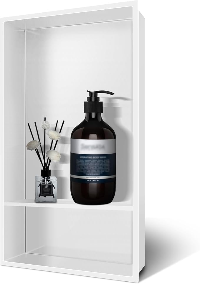 - STYLISH AND MODERN FINISH: This bathroom shower niche features a white finish, adding a modern touch to your bathroom decor. The clean, polished design complements a variety of bathroom styles, whether modern or traditional, and serves as a decorative element in the shower area while also being functional