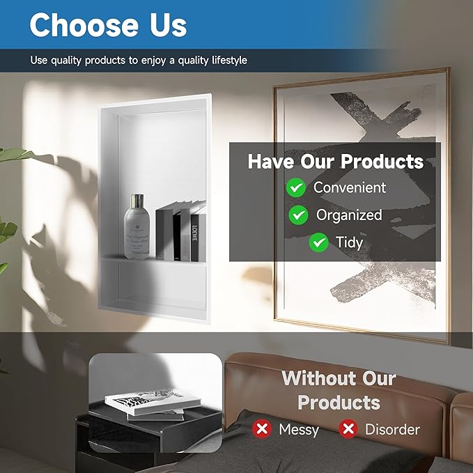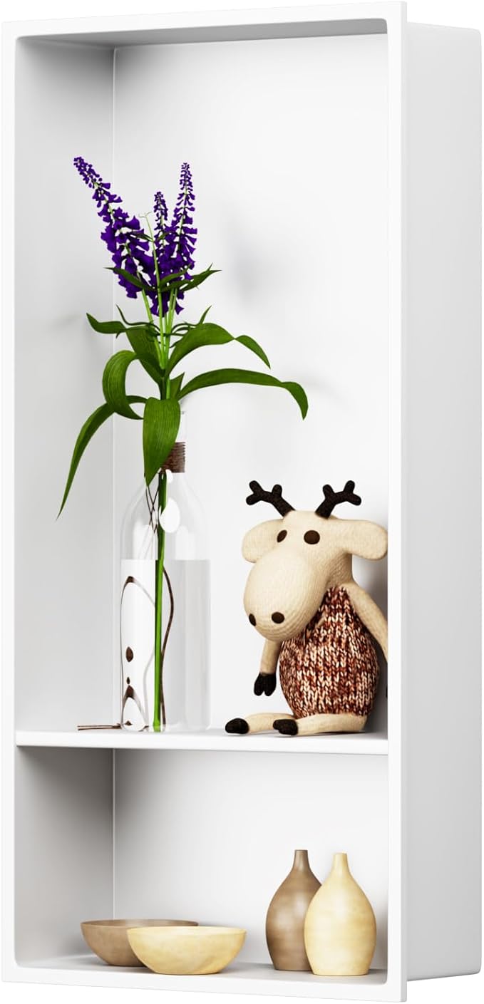 - VERSATILE BATHROOM STORAGE: Practical and stylish, the white shower niche is perfect for organizing shampoo, soaps, and other shower essentials, and can be used as both a bathroom wall shelf and a shower niche insert, providing storage space while adding a stylish, modern touch to your bathroom decor
