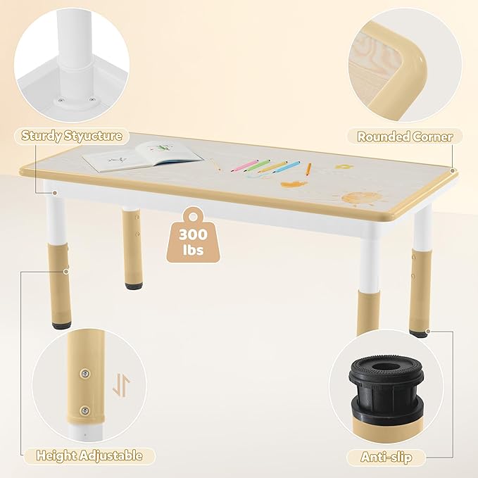 - 1 ✨ 【Height-Adjustable Design】 Table: Features 7 adjustable height levels from 17.7” to 21.65”, accommodating children from ages 3 to 8. Chairs: 4 chairs with 3 adjustable height settings (10.6” to 12.2”) ensure a perfect fit for growing kids.