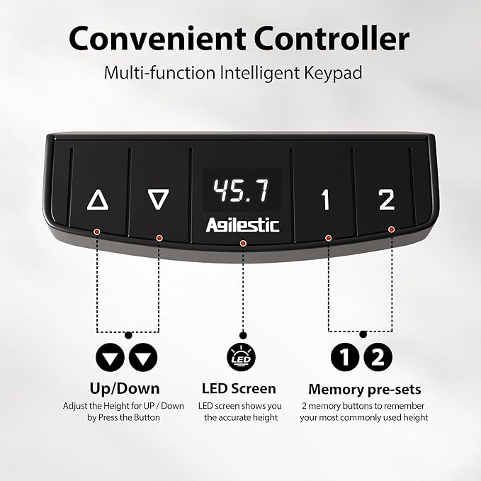 - 【Electric Lifting System】Agilestic standing desk has an advanced motor that can support height adjustment between 28.3''-45.7'' with low noise(under 55 dB) while running. You can customize the desired height and record it using 2 memory keys.