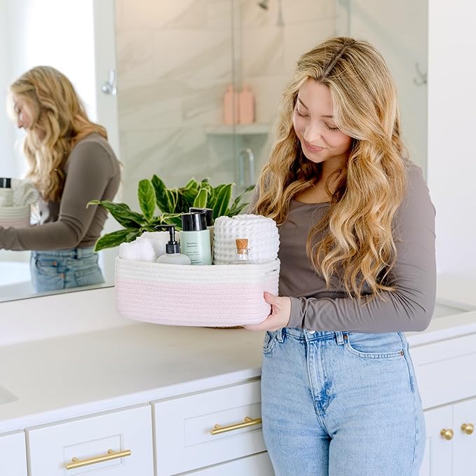 - Safe, Natural Cotton Organizer Bins: Crafted from the highest quality material in the market, our storage bins are oh-so-sturdy (and cute) and ready to take on little humans. They’re 100% safe, so you can rest easy if teething toddlers take a nibble. Reinforced Hidden Handles: Now you see ‘em, now you don’t! With completely hidden handles that blend seamlessly into the rope basket, you’ll be the Houdini of home organizing. They’re even double-stitched and reinforced for extra heavy loads!
