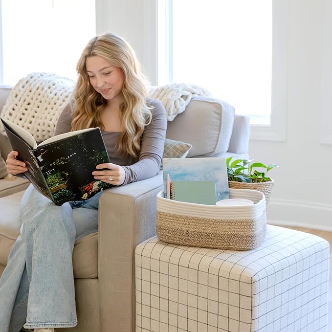 - Safe, Natural Cotton Organizer Bins: Crafted from the highest quality material in the market, our storage bins are oh-so-sturdy (and cute) and ready to take on little humans. They’re 100% safe, so you can rest easy if teething toddlers take a nibble. Reinforced Hidden Handles: Now you see ‘em, now you don’t! With completely hidden handles that blend seamlessly into the rope basket, you’ll be the Houdini of home organizing. They’re even double-stitched and reinforced for extra heavy loads!