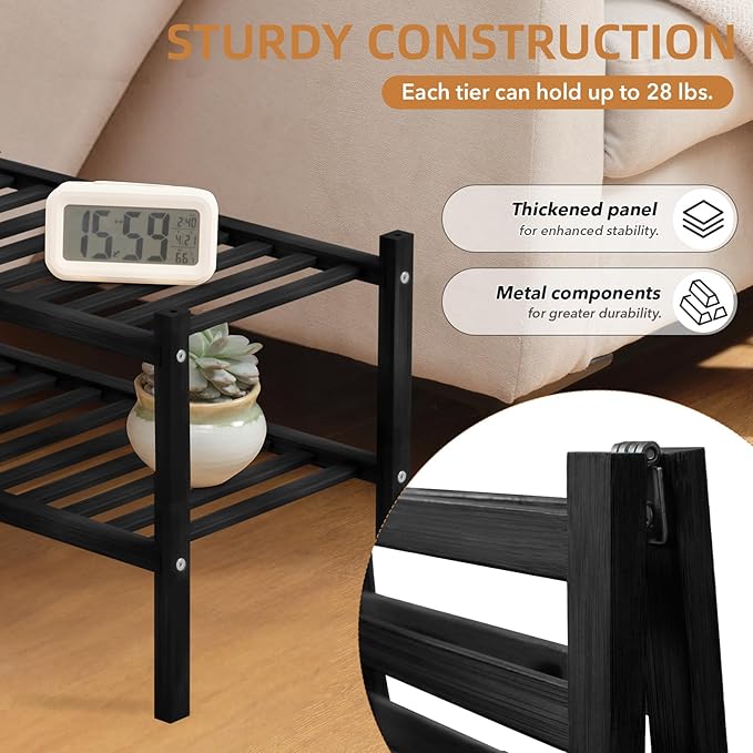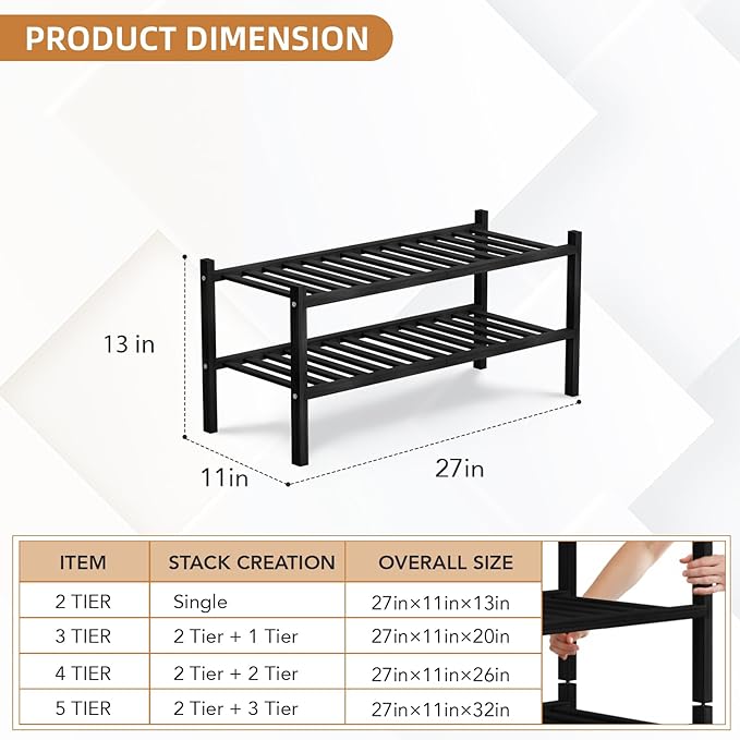 2 Tier Bamboo Shoe Rack Storage Organizer for Closet, Multifunctional Stackable Free Standing Shoe Shelf Organizer for Small Space,Entryway,Hallway,Bathroom 27"x11"x13" (Black, 2 Tier)