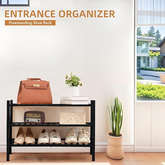 3 Tier Bamboo Shoe Rack Storage Organizer for Closet, Multifunctional Stackable Free Standing Shoe Shelf Organizer for Small Space,Entryway,Hallway,Bathroom 27"x11"x20" (Black, 3 Tier)