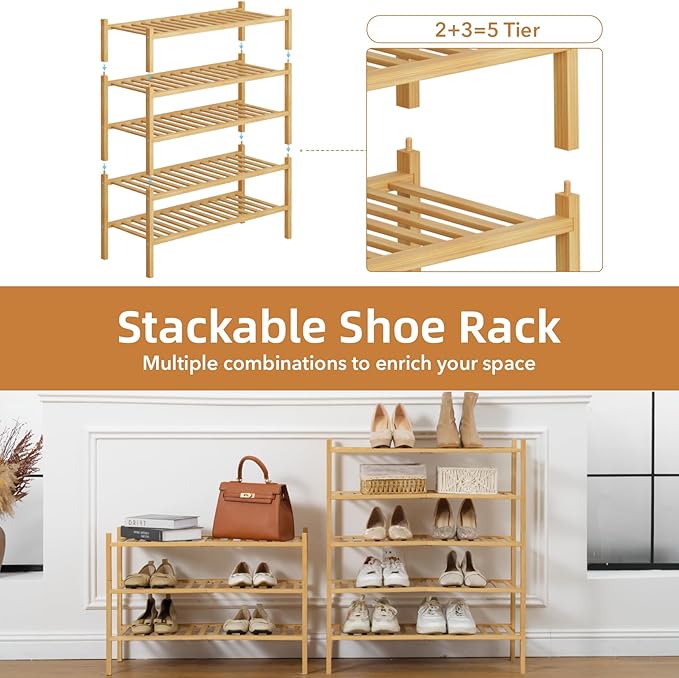 5 Tier Bamboo Shoe Rack Storage Organizer for Closet, Multifunctional Stackable Free Standing Shoe Shelf Organizer for Small Space,Entryway,Hallway,Bathroom 27"x11"x32"(Natural, 5 Tier)