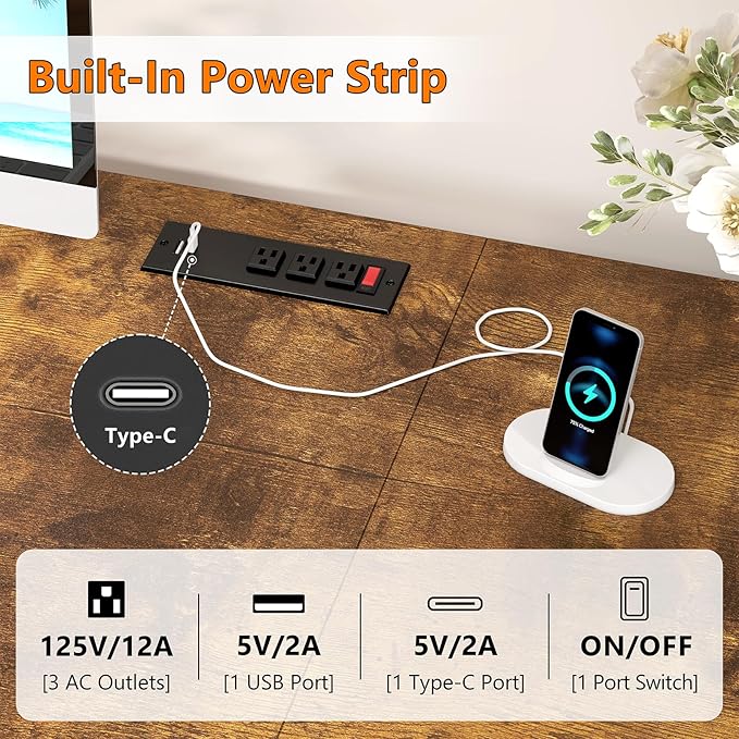 - [INTEGRATED POWER STRIP]: The computer desk with 8 drawers is equipped with integrated power strip, including 1 USB port, 1 TYPE-C port, 3 built-in AC outlets, and an ON/OFF switch, which provides power support for your computer, tablet and phone and keeps your gaming equipment always powered up