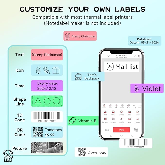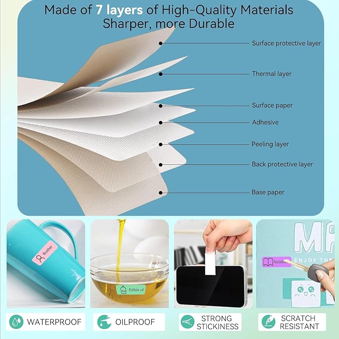 - No Ink Or Toner — Using thermal printing technology to print clearly without ink or ribbon. The printed content can be stored for a long time under normal temperatures. The label paper has strong adhesiveness, no color fade, water-proof, oil-proof, tear-resistant, non-toxic, harmless, and degradable.