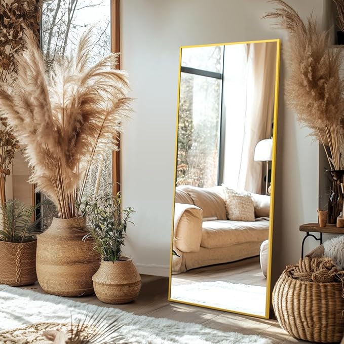 Delma Full Length Standing Mirror,Large Floor Mirror with Aluminum Frame for Bedroom, Bathroom, Living Room,Wall Mount or Freestanding Design(with Stand,Rect 69x24-Gold)