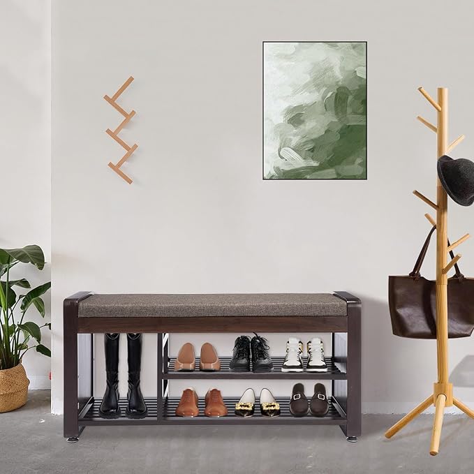 Bamboo Shoe Storage Bench, 3-Tier Shoe Rack with Padded Seat Cushion, Shoe Organizer Shelves for Entryway, Living Room, Bedroom, Hallway, Grey 37.4”