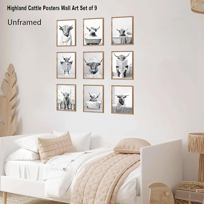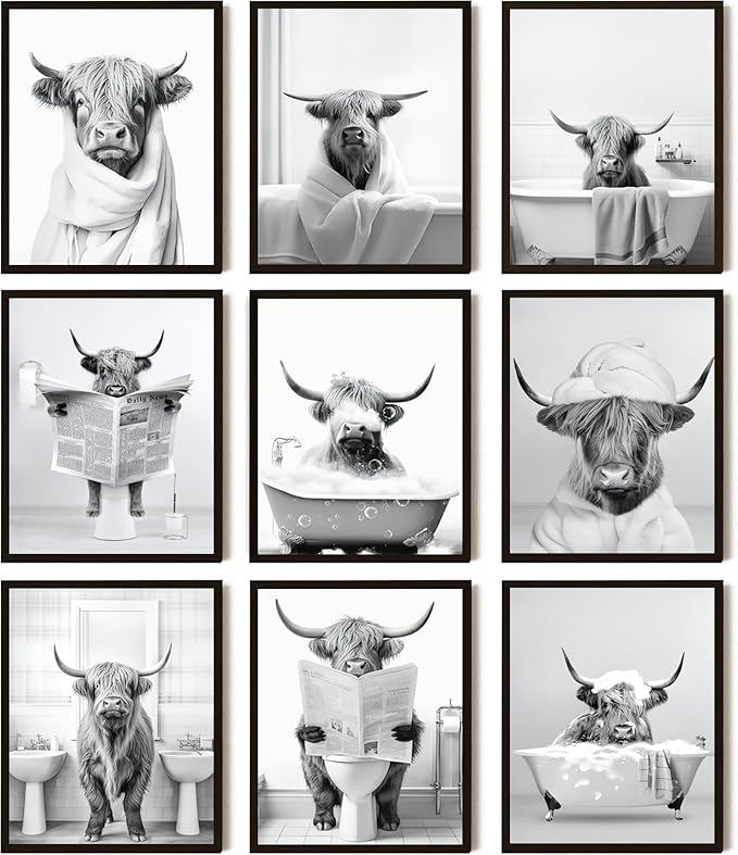- 【Charming Highland Cow Bathroom Decor 】Transform your bathroom into a fun and quirky space with this set of 9 black and white Highland cow pictures. Perfect for adding a rustic, farmhouse touch, these cow-themed prints bring warmth and personality to any room.