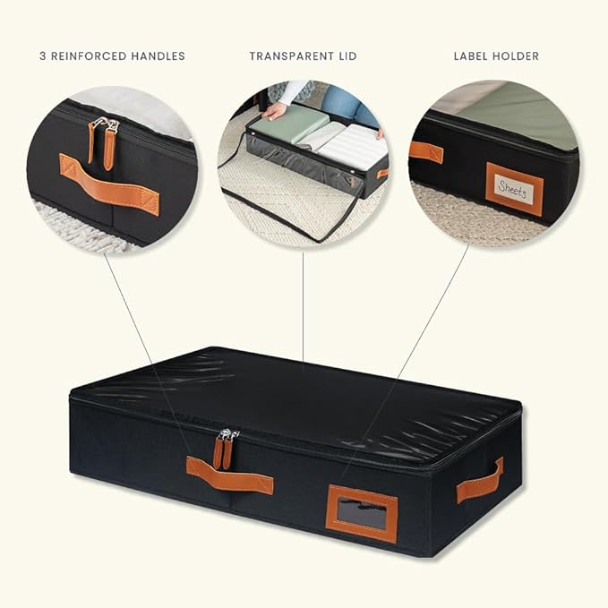 - Clear PVC Lid with Label Pockets: The transparent PVC cover allows for quick content identification, eliminating the need to open the underbed storage containers. Additionally, two large label pockets provide extra organization, making these under bed organizers ideal for sorting clothes, shoes, and accessories.