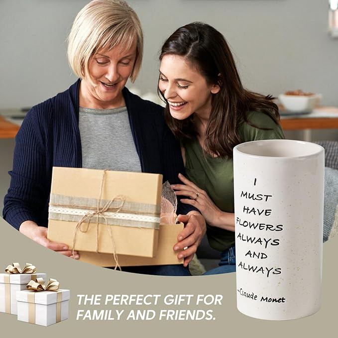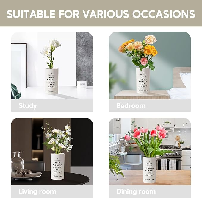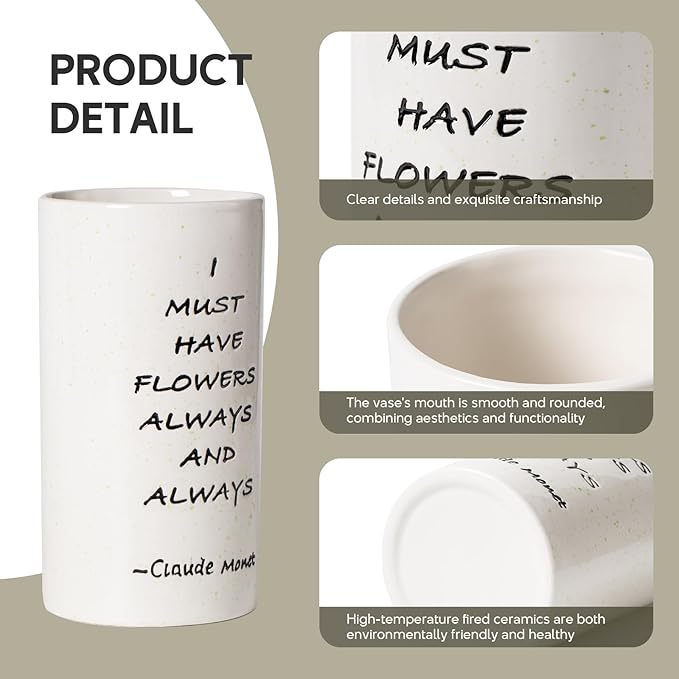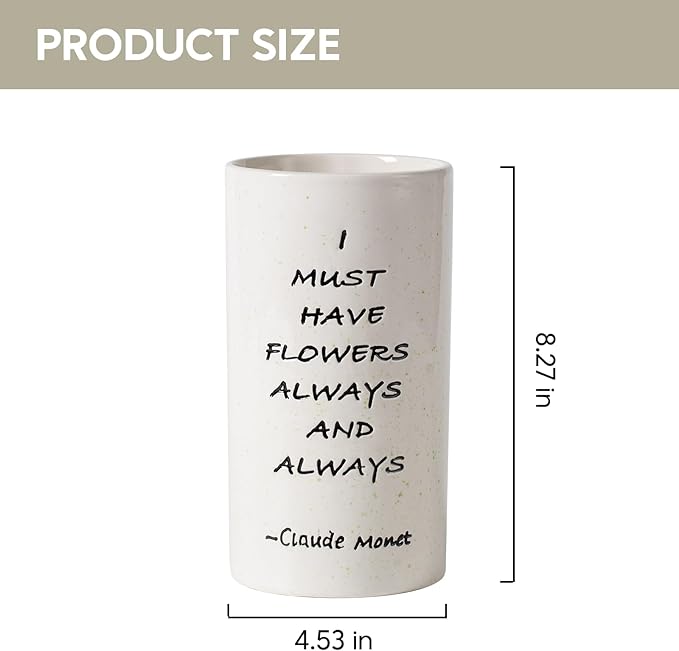 - 8.27 inches tall vase with a charming 'I MUST HAVE FLOWERS ALWAYS AND ALWAYS' quote, perfect for home decor.