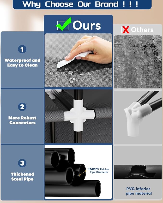 - [Dustproof &Waterproof Cover]: By simply zipping up the door, the fabric cover will keep your clothes safely away from dust. Or keep it open for easy access to your clothes and making it effortless to get ready before heading out.