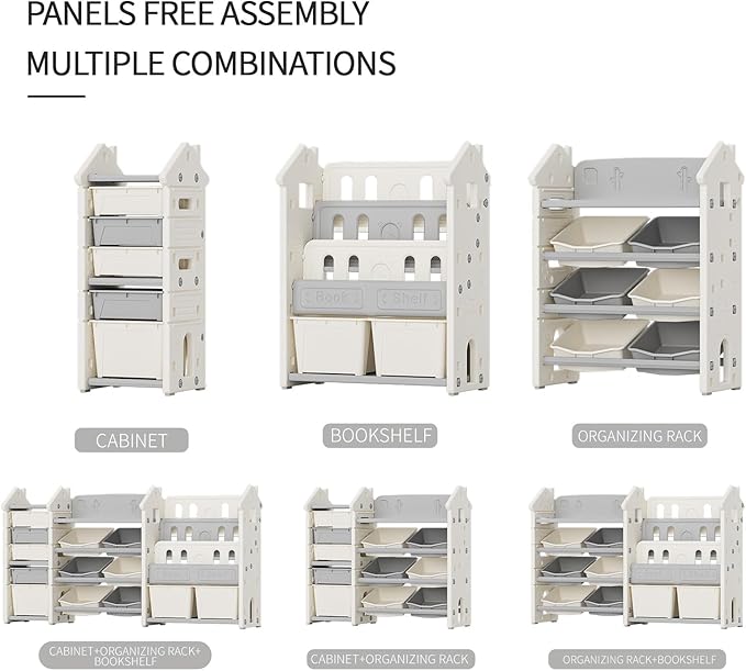 - Versatile Storage Solution: This large-capacity Toy Storage Organizer designed with multiple compartments for various storage needs. included toy Storage bins and cabinets, kids bookshelf. The sloped, large-capacity design ensures easy access, making organization effortless for both children and parents. Perfect for keeping playrooms and bedrooms tidy!