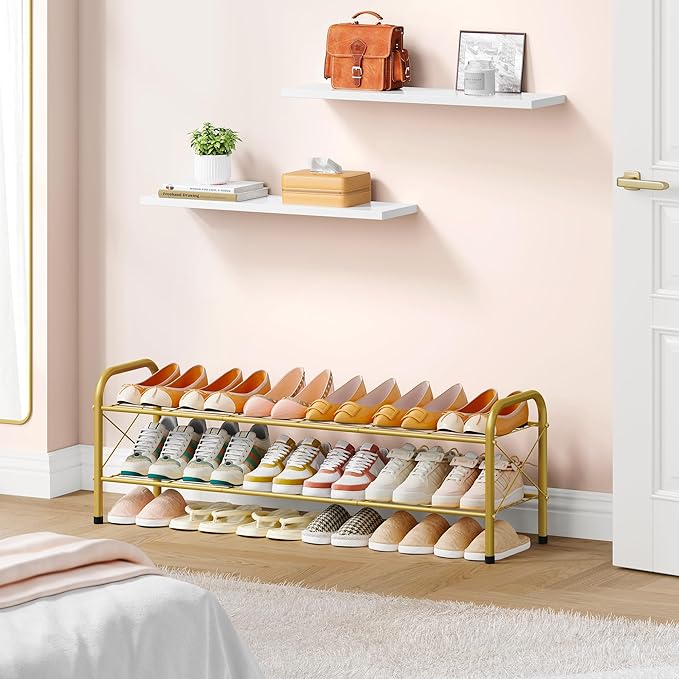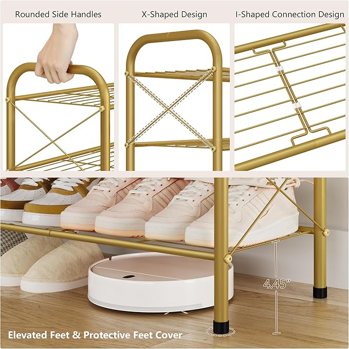 Hoctieon 2 Tier Shoe Rack for Closet, Durable Mesh Style Shoe Rack, Entryway Shoe Shelf, Shoe Storage Organizer for Hallway, Bedroom, Living Room, Wardrobe, Gold