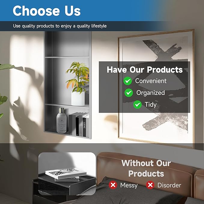 - VERSATILITY: This shower niche is not only the perfect bathroom shower niche, it can also be used as a kitchen spice rack, living room display rack, or bedroom organizer. Multiple depth compartments accommodate everything from tall bottles to folded towels
