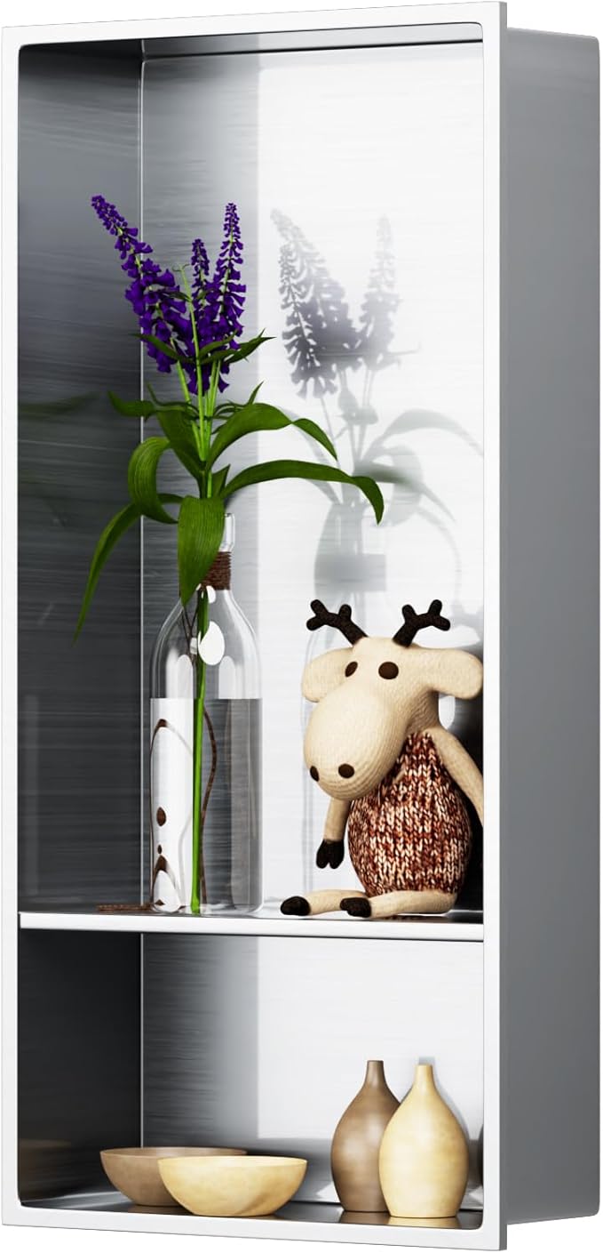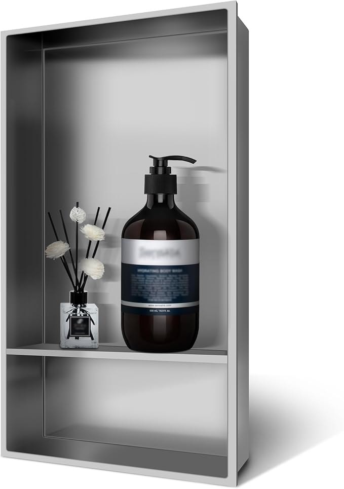 - STYLISH FINISH: Elevate the beauty of your bathroom with a modern brushed nickel shower niche. Its polished niche insert design complements any decor and blends seamlessly into modern or traditional spaces while resisting fingerprints and water stains