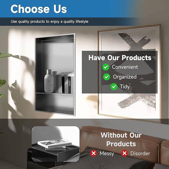 - SPACIOUS DUAL-TIER DESIGN: This shower niche shelf measures 25"H x 12"W, providing ample storage space for all bathroom essentials, featuring dual-tier dividers to organize shampoo, soap, and body wash. Bathroom shower niche features a recessed niche design to ensure items stay dry and easily accessible
