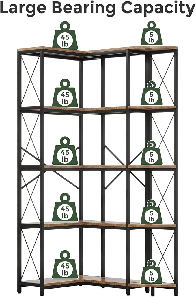 5-Tier Reversible Corner Bookshelf, Modern Industrial Bookcase, 5-Shelf Large L-Shaped Storage Shelf Display Rack with Metal Frame for Living Room, Home Office, Bedroom, Rustic Brown
