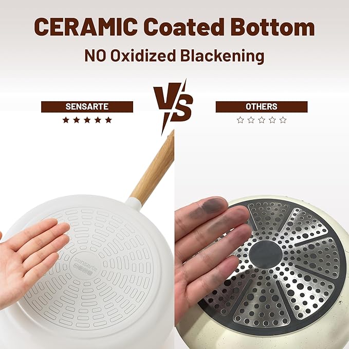 - Exclusive Design Compound Bottom: Innovative SUNSHINE bottom for better heat gathering, stronger magnetic conductivity, fast and even heating. Fully coated bottom solves the problem of oxidized blackening and protects the glass countertop from scratches. Dishwaser Safe. All cooktops compatable include indcution.