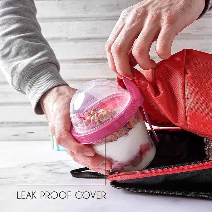 - REUSABLE YOGURT CUPS WITH LEAK-PROOF LIDS: Mini breakfast or lunch cereal and milk/yogurt on the go cups with spoon and topping compartment for kids, adults. Drop Resistance, BPA-free high-quality, and clear plastic material.