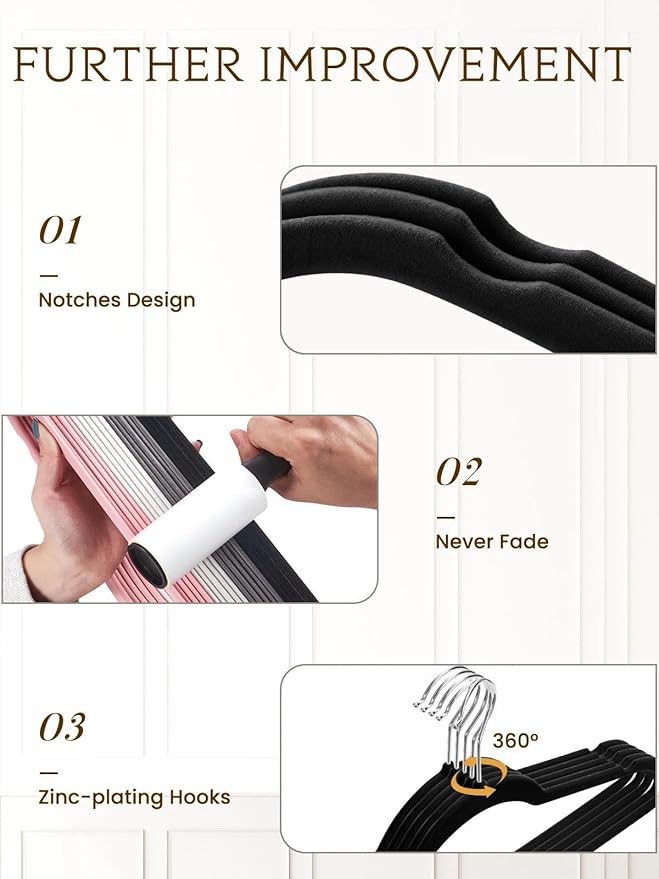 - Black Non Slip Hangers: Made from soft velvet, durable ABS plastic and featuring a 360°swivel hook, the 70-pack hangers are built to withstand the weight of your heavy clothes. Hang winter coats or jackets, our flocked slim hangers are thick and durable enough, not easy to break or bend