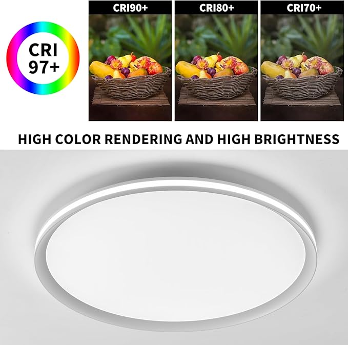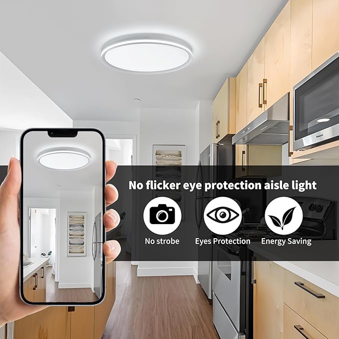 - 【Memory Function+Mobile APP Control】The dimmable LED ceiling light can be continuously adjusted brightness(10% to 100%) and changed color temperature(3000K to 6500K) by the remote control, and even a soft night light function. This hallway light fixture ceiling has a memory function, and the next time you turn it on, the previous light color will still be displayed.