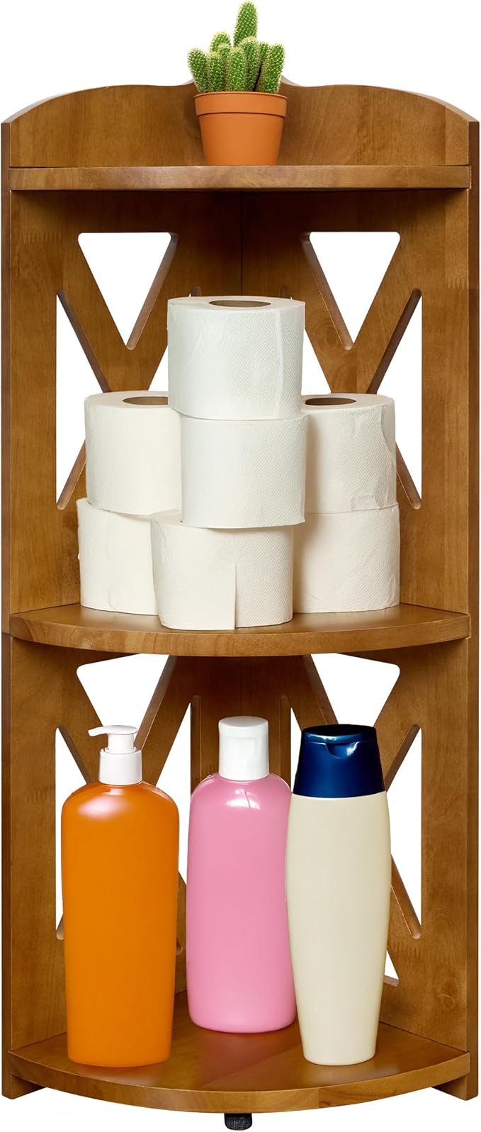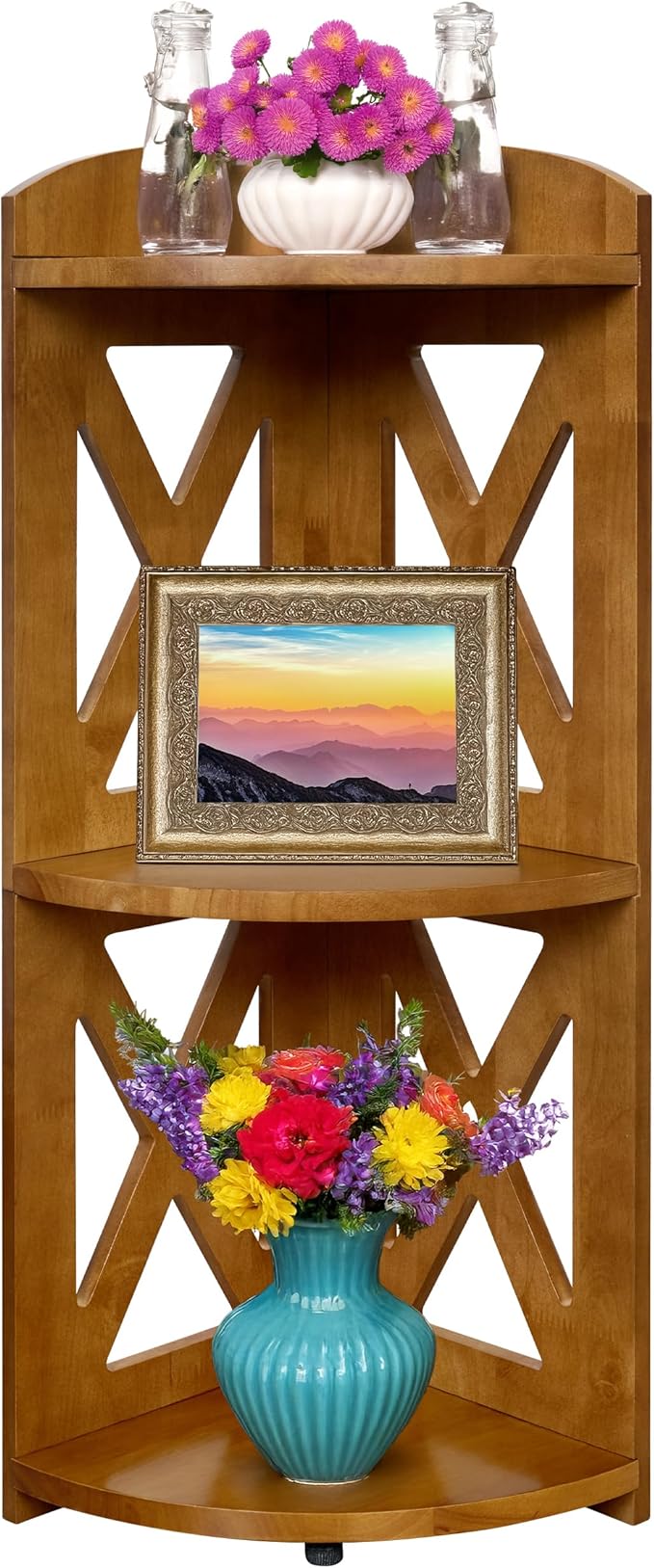 Corner Shelf Stand, Corner Bookshelf, Small Corner Shelves by Natural Wood, Plant Stand, Corner Bookcase for Living Room, Home Office, Bedroom, (Brown, 3 Tier X)
