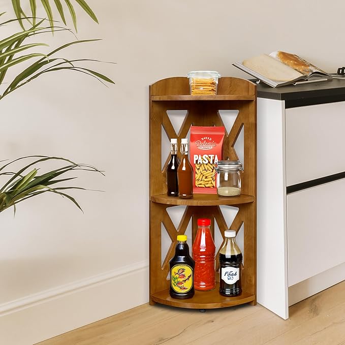 - [SOLID CONSTRUCTION] Crafted with sturdy natural wood planks, our corner shelves are built to last. This freestanding shelving unit can hold up to 22 lbs per tier and can be used for living room, bedroom, kitchen or bathroom