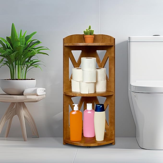 - [EASY TO INSTALL AND MOVE] The 3-tier corner shelf is designed for simple assembly, you only need 10 minutes to assemble it. The wooden plate at the foot has an anti-tip adjustment button to help it stand independently.