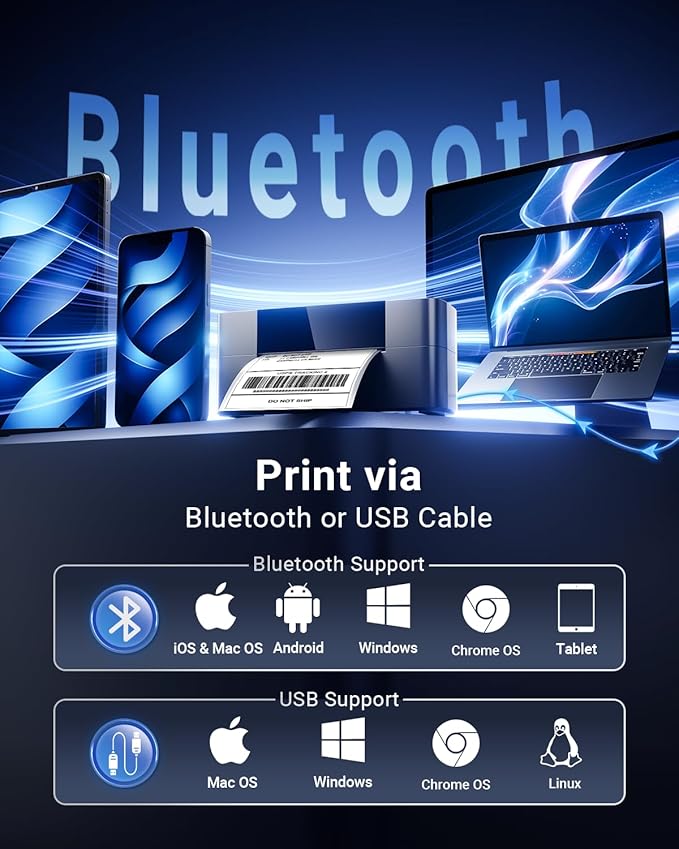 - Upgraded 245BT Bluetooth Shipping Label Printer - Quick, Simple, and Affordable! The thermal shipping label printer 4x6 offers both Bluetooth and USB connectivity options. Leave behind the old-fashioned printing methods and step into the future of printing technology. The Bluetooth connection is compatible with iOS, Android, Mac OS, Windows and Chrome OS. If you favor a USB connection, this shipping label printer is also compatible with Windows, Mac OS, Chrome OS, and Linux system