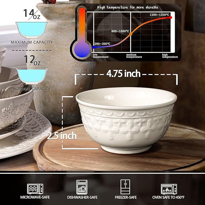 Small Ceramic Bowls - 14 Oz Ice Cream Bowls Set of 4, White Embossment Dessert Bowl for Kitchen, Soup, Side Dishes, Oatmeal, Rice, 4.75 Inch Microwave Oven Safe(Cross Floral)
