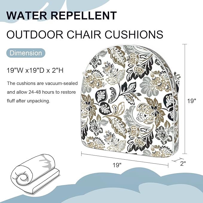 - 【PACKAGE】 - Including 4pcs outdoor chair pads measuring 19" W x 19" D x 2" H. Please measure the dimensions of your furniture's seating area before purchasing. NOTE: The seat cushions are vacuum compression, please wait 24 hours to expand to final size listed in description