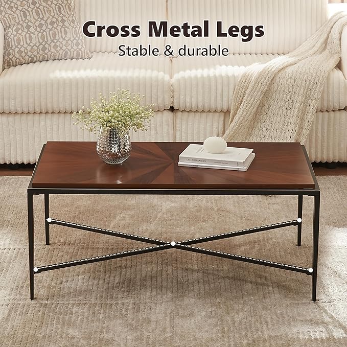 EDYO LIVING Mid Century Modern Coffee Table with Cross Metal Legs, 41.3” Wooden Single Tier Coffee Table, Retro Accent Sofa Center Table for Living Room, Home Office, Brown