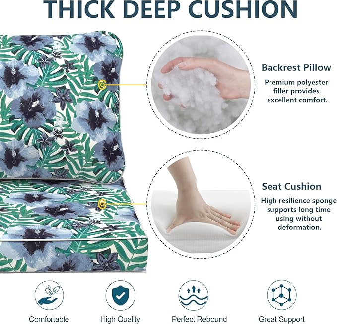 Outdoor Deep Seat Cushions Set 24 x 24 Inch for Patio Furniture,Water Resistant Chair Cushions Replacement Includes Seat Cushion & Back Pillow for Sofa, Wicker Chair - Blue Salmone Tropical